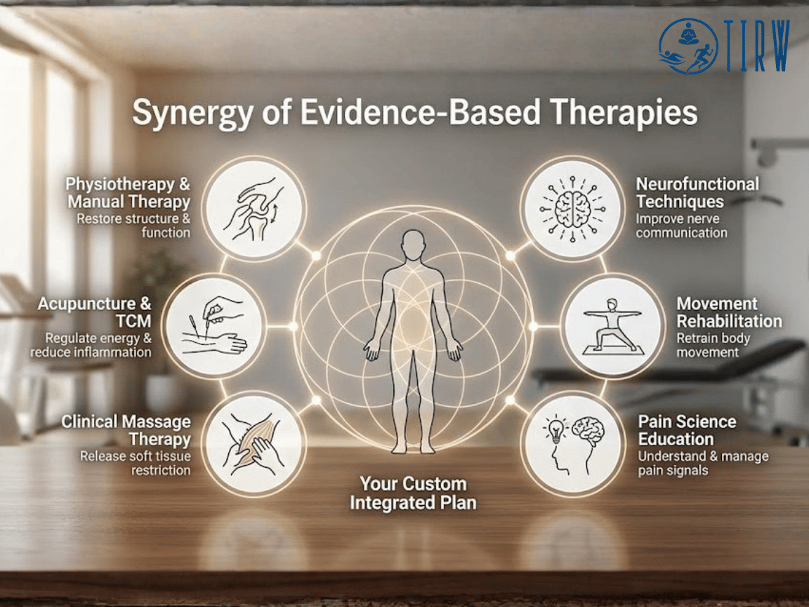 Integrated Care is more than just having different practitioners under one roof; it is a philosophy of connection. It blends evidence-based rehabilitation, hands-on manual therapies, traditional healing practices (like TCM), functional movement, and wellness coaching into one seamless approach.
